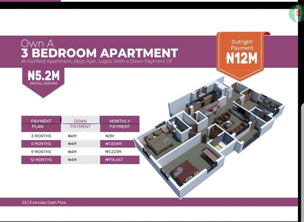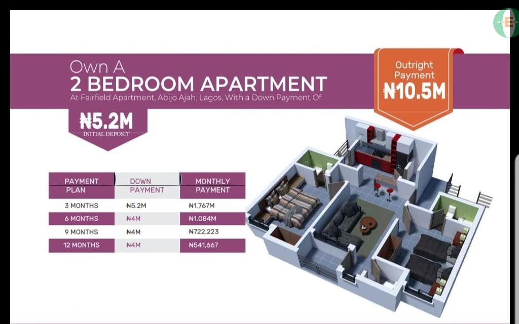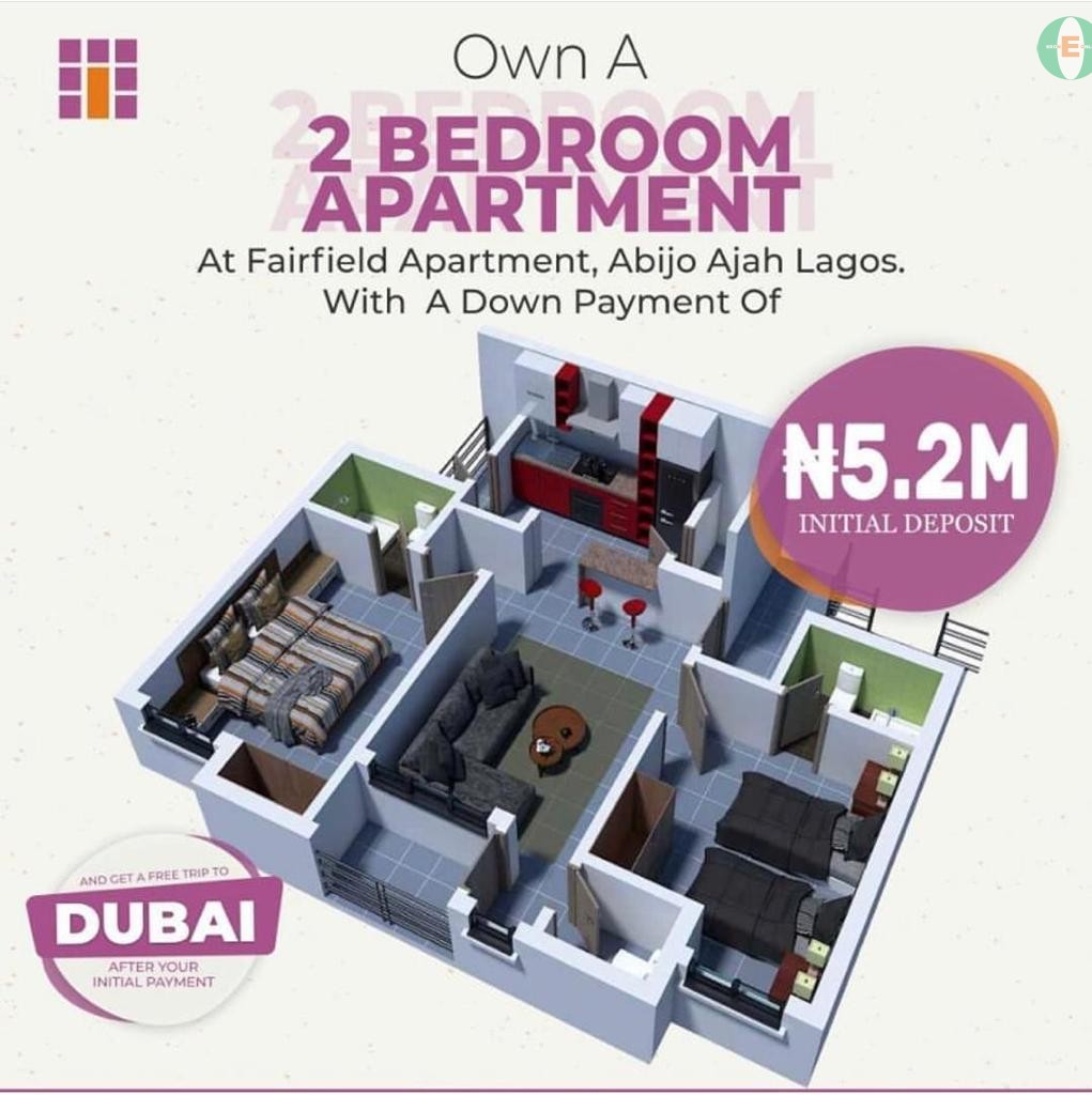 View All AdsFairfield Apartments, New Lagos City, Abijo* With a down payment of N5.2m(own 2 or 3 bedroom apartments or penthouse) *2 bedroom apartments (N10.5m)* *3 bedroom apartments (N12.5m)* *3 bedroom penthouses (N15m)* The estate will have a man made lake, street lights, drainages, green areas, security, sports arena etc. It is located about 7 mins from the Lagos Business School, and 12 mins from VGC Ajah. Since rental income is a cool and quiet way of making good money, a 2 bedroom apartment in this environment commands rental value of N800k - N1.2m annually. Imagine owning a 2 bedroom apartment in an exquisite estate just opposite the GRA. We present you with this great opportunity to own 2 or 3 bedroom apartments or penthouse with a down payment of N5.2m only...and spread the balance over 12 months. *NB:* Your N5.2m down payment also qualifies you for an all expense paid trip to Dubai ! Let's help you position properly for the rental income revolution of the future!