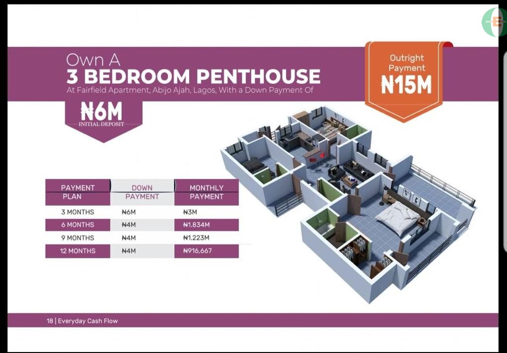 Fairfield Apartments, New Lagos City, Abijo* With a down payment of N5.2m(own 2 or 3 bedroom apartments or penthouse) *2 bedroom apartments (N10.5m)* *3 bedroom apartments (N12.5m)* *3 bedroom penthouses (N15m)* The estate will have a man made ...