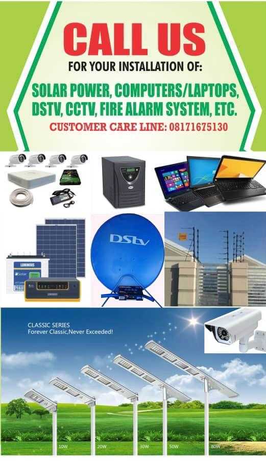View All AdsCall us for your: Solar power Installation Satellite dish Installation CCTV Installation Installation and maintenance of fire alarm systems. Call or whatsapp: 08033145416, 08171675130