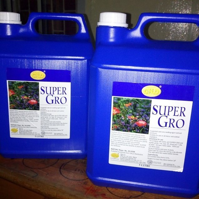 View All AdsSuper Gro is a natural liquid fertilizer which was developed to ensure the enhancement of your crops and agricultural productivity both in quality and quantity. It is a natural fertilizer that will increase your agricultural yield. ADVANTAGES TO FISH FARMING ARE: 1. It promotes the growth of phytoplankton in the pond. 2. It prevents fish mortality and cannibalism. 3. It increases the ability of oxygen dissolving in fish pond. 4. It reduces changing water on daily basis. 5. It reduces ammonia level and maintains water PH. 6. It promotes uniform growth of the fish. 7. It is effective in many types of fish pond e.g. plastic, earth and concrete pond. 8. It is hygienic when compared with organic mature. 9. It also prevents offensive odors and scurrying. ADVANTAGES ON FARM PRODUCE ARE: 1. Concentrate that increase plant yield by as much as 200% 2. Makes water "wetter" 3. It has internal ability to absorb Solar Energy and gum to the plant for maximum use. 4. Improves the absorption of nutrients. 5. It breaks the surface tension of water. 6. It is absorbed faster and keeps plants wet in warm dry weather 7. It acts as wetting agent. It increases the rate at which water enters the soil. Use as often as you choose (every 3 weeks interval) 8. It is bio-degraded, not harmful, nontoxic, non-flammable, environmental friendly. 9. Does not affect the pH balance of the soil or destroy the land. It simply increases the yield. 10. It feeds, renews and revitalizes the plant. The seed, the stalk and the leaves are greatly improved It can also be used in poultry feeds to prevent diseases. It is very effective and durable, the product can last up to 3months. For further enquiries: Contact 08141727040
