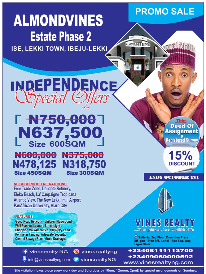PROMO SALES ALMOND VINES ESTATE (PHASE 1) Almond Vines Estate Phase 1, is located at Okun-ise 3 minutes drive from La’Campaigne Tropicana Beach Resort. It is currently selling for: #900,000 = 600sqm Title= DEED OF ASSIGNMENT AND REGISTERED SURVEY. Hu...