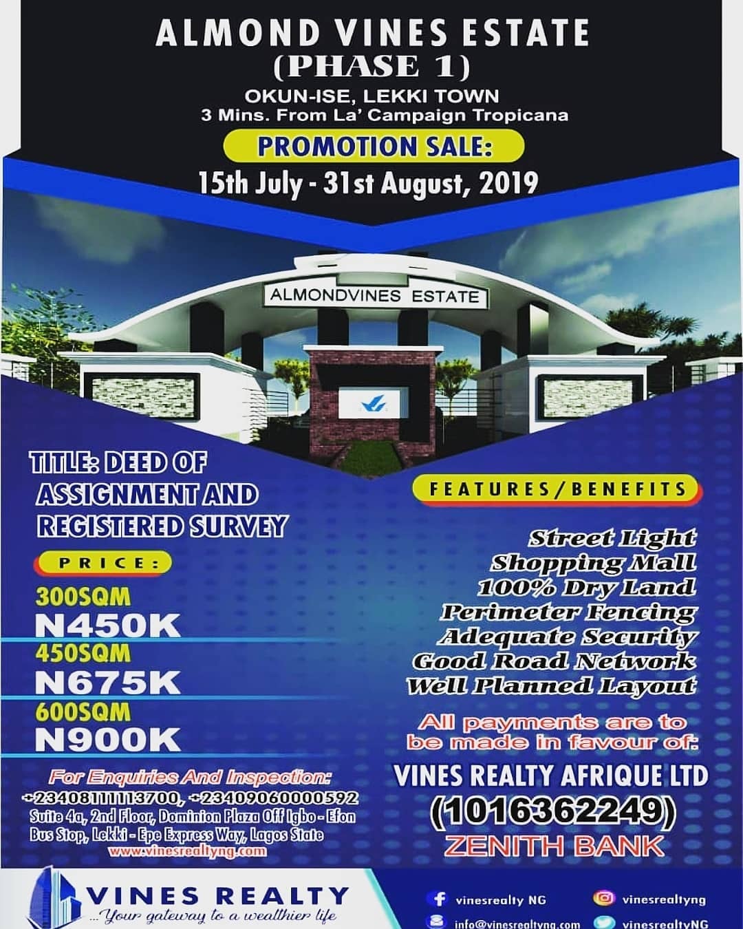 View All AdsPROMO SALES ALMOND VINES ESTATE (PHASE 1) Almond Vines Estate Phase 1, is located at Okun-ise 3 minutes drive from La'Campaigne Tropicana Beach Resort. It is currently selling for: #900,000 = 600sqm Title= DEED OF ASSIGNMENT AND REGISTERED SURVEY. Hurry!! Don't be left out of this golden opportunity while the offer last. Market Status=Available. For Enquiries and inspection Visit: www.vinesrealtyng.com Tel: +2349060000592 +2348111113700 Vines Realty your gateway to a wealthier life.